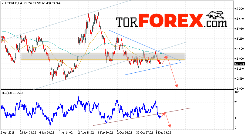 В пользу снижения пары USD/RUB 11 декабря 2019 выступит тест пробитой линии тренда на индикаторе относительной силы. Вторым сигналом станет отскок от верхней границы модели «Треугольник». Отменой варианта падения пары USD/RUB на Форекс станет сильный рост и пробой уровня 67.05 Рублей за Доллар. Это укажет на пробой области сопротивления и продолжение роста пары Доллар Рубль в область выше уровня 67.05. Подтверждением падения пары выступит пробой области поддержки и закрытие под уровнем 63.05, что также укажет на пробой нижней границы модели «Треугольник».