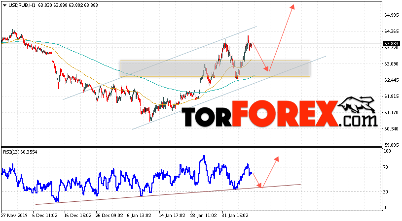 Дополнительным сигналом в пользу роста пары USD/RUB 11 февраля 2020 выступит тест линии тренда на индикаторе относительной силы. Вторым сигналом станет отскок от ниэенй границы восходящего канала. Отменой варианта роста пары USD/RUB на Форекс станет падение и пробой уровня 62.15 Рублей за Доллар. Это укажет на пробой области поддержки и продолжение падения пары Доллар Рубль в область ниже уровня 60.05. Подтверждением роста пары выступит пробой области сопротивления и закрытие над уровнем 64.55.