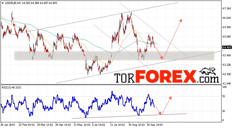 В пользу роста пары USD/RUB 11 октября 2019 выступит тест пробитой линии тренда на индикаторе относительной силы. Вторым сигналом станет отскок от нижней границы восходящего канала. Отменой варианта роста пары USD/RUB на Форекс станет падение и пробой уровня 62.50 Рублей за Доллар. Это укажет на пробой области поддержки и продолжение снижения пары Доллар Рубль в область ниже уровня 61.05. Подтверждением подъёма пары выступит пробой верхней границы нисходящего канала и закрытие над уровнем 66.05, что укажет на выход котировок за пределы разворотной модели.