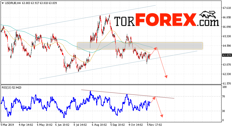 В пользу падения пары USD/RUB 12 ноября 2019 выступит тест нисходящей линии тренда на индикаторе относительной силы. Вторым сигналом станет отскок от области сопротивления. Отменой варианта падения пары USD/RUB на Форекс станет сильный рост и пробой уровня 65.45 Рублей за Доллар. Это укажет на пробой области сопротивления и продолжение роста пары Доллар Рубль в область выше уровня 67.85. Подтверждением падения пары выступит пробой области поддержки и закрытие под уровнем 62.45.