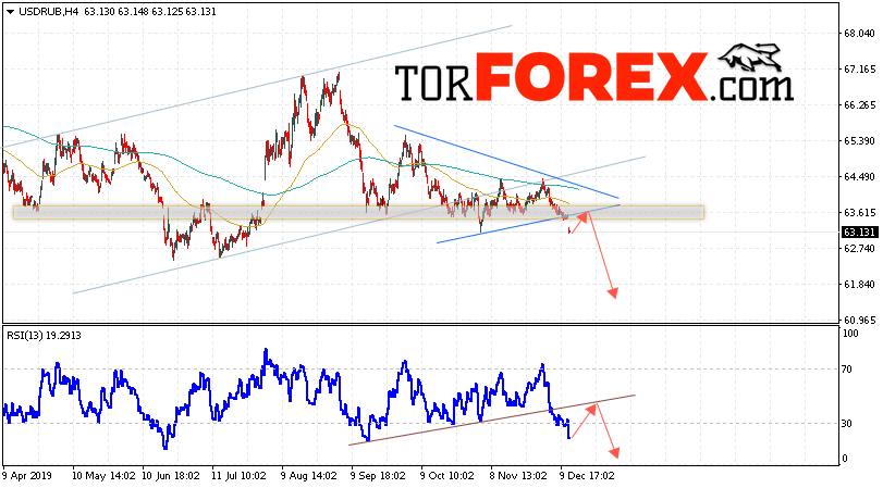 В пользу снижения пары USD/RUB 13 декабря 2019 выступит тест пробитой линии тренда на индикаторе относительной силы. Вторым сигналом станет отскок от нижней границы модели «Треугольник». Отменой варианта падения пары USD/RUB на Форекс станет сильный рост и пробой уровня 65.25 Рублей за Доллар. Это укажет на пробой области сопротивления и продолжение роста пары Доллар Рубль в область выше уровня 67.05. Подтверждением падения пары выступит пробой области поддержки и закрытие под уровнем 62.65, что также укажет на пробой нижней границы модели «Треугольник».
