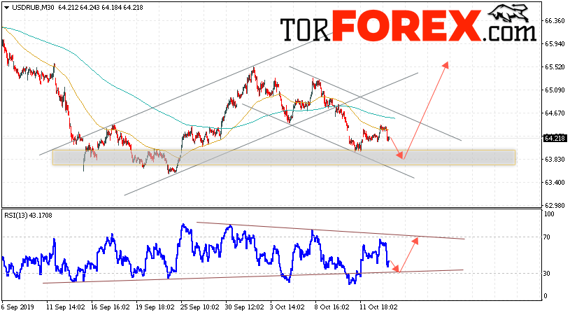 В пользу роста пары USD/RUB 16 октября 2019 выступит тест линии поддержки на индикаторе относительной силы. Вторым сигналом станет отскок от нижней границы нисходящего канала. Отменой варианта роста пары USD/RUB на Форекс станет падение и пробой уровня 63.15 Рублей за Доллар. Это укажет на пробой области поддержки и продолжение снижения пары Доллар Рубль в область ниже уровня 61.55. Подтверждением подъёма пары выступит пробой верхней границы нисходящего канала и закрытие над уровнем 64.85, что укажет на выход котировок за пределы нисходящего канала.