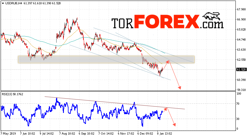 В пользу снижения пары USD/RUB 16 января 2020 выступит тест нисходящей линии тренда на индикаторе относительной силы. Вторым сигналом станет отскок от верхней границы нисходящего канала. Отменой варианта падения пары USD/RUB на Форекс станет сильный рост и пробой уровня 63.65 Рублей за Доллар. Это укажет на пробой области сопротивления и продолжение роста пары Доллар Рубль в область выше уровня 65.85. Подтверждением падения пары выступит пробой области поддержки и закрытие под уровнем 61.05.