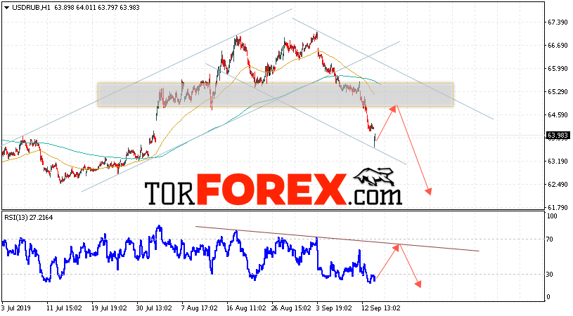 Валютная пара Доллар Рубль USD/RUB продолжает движение в рамках снижения и нисходящего канала. В момент публикации прогноза курс Доллара США к Российскому Рублю составляет 63.98. Скользящие средние указывают на наличие нисходящей тенденции. В рамках прогноза курса USD/RUB на завтра 17 сентября 2019 года стоит ожидать попытку роста и тест уровня сопротивления вблизи области 64.70 Рублей за Доллар США. Затем, отскок и продолжение падения валютной пары в область ниже уровня 62.35.