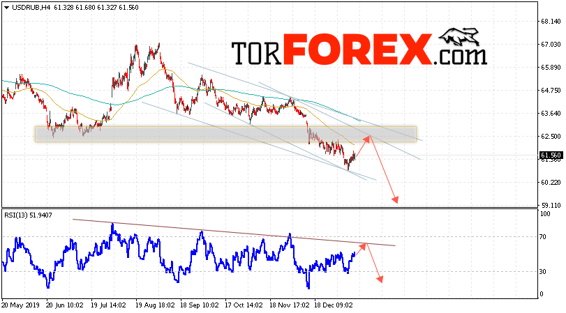 В пользу снижения пары USD/RUB 17 января 2020 выступит тест нисходящей линии тренда на индикаторе относительной силы. Вторым сигналом станет отскок от верхней границы нисходящего канала. Отменой варианта падения пары USD/RUB на Форекс станет сильный рост и пробой уровня 63.65 Рублей за Доллар. Это укажет на пробой области сопротивления и продолжение роста пары Доллар Рубль в область выше уровня 65.85. Подтверждением падения пары выступит пробой области поддержки и закрытие под уровнем 61.05.