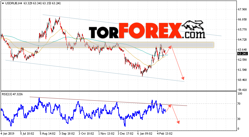 Дополнительным сигналом в пользу снижения пары USD/RUB 18 февраля 2020 выступит тест линии сопротивления на индикаторе относительной силы. Вторым сигналом станет отскок от верхней границы нисходящего канала. Отменой варианта падения пары USD/RUB на Форекс станет сильный рост и пробой уровня 65.75. Рублей за Доллар. Это укажет на пробой области сопротивления и продолжение роста пары Доллар Рубль в область выше уровня 67.25. Подтверждением падения пары выступит пробой области поддержки и закрытие под уровнем 62.25.