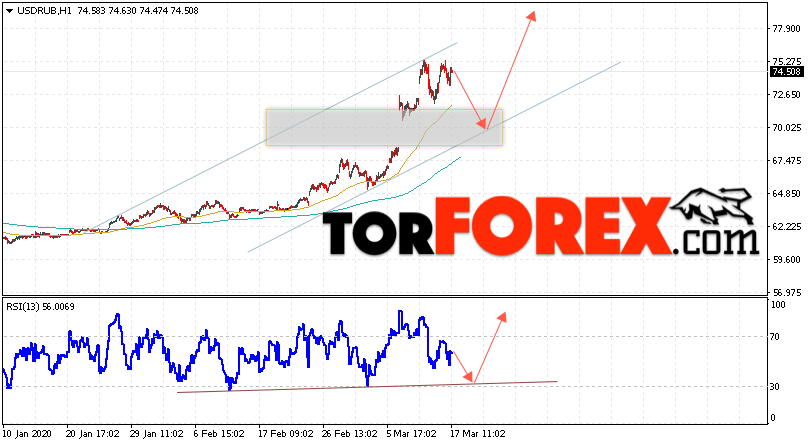 Дополнительным сигналом в пользу роста пары USD/RUB 18 марта 2020 выступит тест линии поддержки на индикаторе относительной силы. Вторым сигналом станет отскок от нижней границы восходящего канала. Отменой варианта роста пары USD/RUB на Форекс станет падение и пробой уровня 67.65. Рублей за Доллар. Это укажет на пробой области поддержки и продолжение снижения пары Доллар Рубль в область ниже уровня 65.05. Подтверждением роста пары выступит пробой области сопротивления и закрытие над уровнем 76.95.