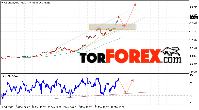 Дополнительным сигналом в пользу роста пары USD/RUB 19 марта 2020 выступит тест линии поддержки на индикаторе относительной силы. Вторым сигналом станет отскок от нижней границы восходящего канала. Отменой варианта роста пары USD/RUB на Форекс станет падение и пробой уровня 72.05. Рублей за Доллар. Это укажет на пробой области поддержки и продолжение снижения пары Доллар Рубль в область ниже уровня 65.05. Подтверждением роста пары выступит пробой области сопротивления и закрытие над уровнем 76.95.
