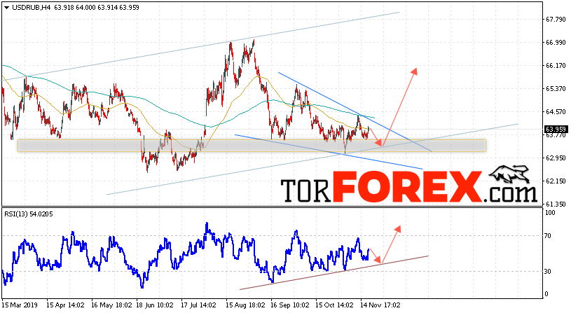 В пользу роста пары USD/RUB 21 ноября 2019 выступит тест восходящей линии тренда на индикаторе относительной силы. Вторым сигналом станет отскок от нижней границы восходящего канала. Отменой варианта роста пары USD/RUB на Форекс станет падение и пробой уровня 62.45 Рублей за Доллар. Это укажет на пробой области поддержки и продолжение падения пары Доллар Рубль в область ниже уровня 60.05. Подтверждением роста пары выступит пробой верхней границы модели «Клин» и закрытие над уровнем 64.95.
