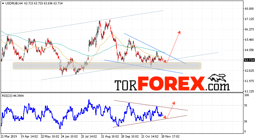 В пользу роста пары USD/RUB 22 ноября 2019 выступит тест восходящей линии тренда на индикаторе относительной силы. Вторым сигналом станет отскок от нижней границы восходящего канала. Отменой варианта роста пары USD/RUB на Форекс станет падение и пробой уровня 62.35 Рублей за Доллар. Это укажет на пробой области поддержки и продолжение падения пары Доллар Рубль в область ниже уровня 60.05. Подтверждением роста пары выступит пробой верхней границы модели «Клин» и закрытие над уровнем 64.95.