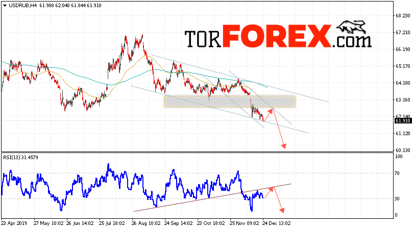 В пользу снижения пары USD/RUB 25 декабря 2019 выступит тест нисходящей линии тренда на индикаторе относительной силы. Вторым сигналом станет отскок от верхней границы нисходящего канала. Отменой варианта падения пары USD/RUB на Форекс станет сильный рост и пробой уровня 63.85 Рублей за Доллар. Это укажет на пробой области сопротивления и продолжение роста пары Доллар Рубль в область выше уровня 65.45. Подтверждением падения пары выступит пробой области поддержки и закрытие под уровнем 61.25.