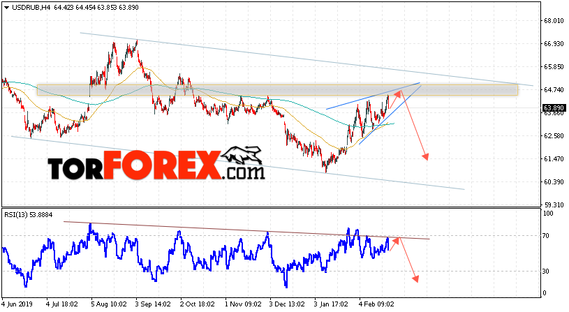 Дополнительным сигналом в пользу снижения пары USD/RUB 25 февраля 2020 выступит тест линии сопротивления на индикаторе относительной силы. Вторым сигналом станет отскок от верхней границы модели «Треугольник». Отменой варианта падения пары USD/RUB на Форекс станет сильный рост и пробой уровня 64.95. Рублей за Доллар. Это укажет на пробой области сопротивления и продолжение роста пары Доллар Рубль в область выше уровня 66.85. Подтверждением падения пары выступит пробой области поддержки и закрытие под уровнем 62.65.