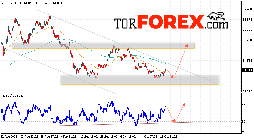 В пользу роста пары USD/RUB 25 октября 2019 выступит тест линии поддержки на индикаторе относительной силы. Вторым сигналом станет отскок от нижней границы разворотной модели. Отменой варианта роста пары USD/RUB на Форекс станет падение и пробой уровня 62.75 Рублей за Доллар. Это укажет на пробой области поддержки и продолжение снижения пары Доллар Рубль в область ниже уровня 61.45. Подтверждением подъёма пары выступит пробой области сопротивления и закрытие над уровнем 64.65, что укажет на выход котировок за пределы нисходящего канала.
