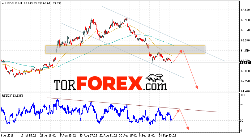 В пользу падения пары USD/RUB 25 сентября 2019 выступит тест нисходящей линии сопротивления на индикаторе относительной силы. Вторым сигналом станет отскок от верхней границы нисходящего канала. Отменой варианта падения пары USD/RUB на Форекс станет сильный рост и пробой уровня 65.45 Рублей за Доллар. Это укажет на пробой области сопротивления и продолжение роста пары Доллар Рубль в область выше уровня 66.75. Подтверждением падения пары выступит пробой области поддержки и закрытие под уровнем 63.05.