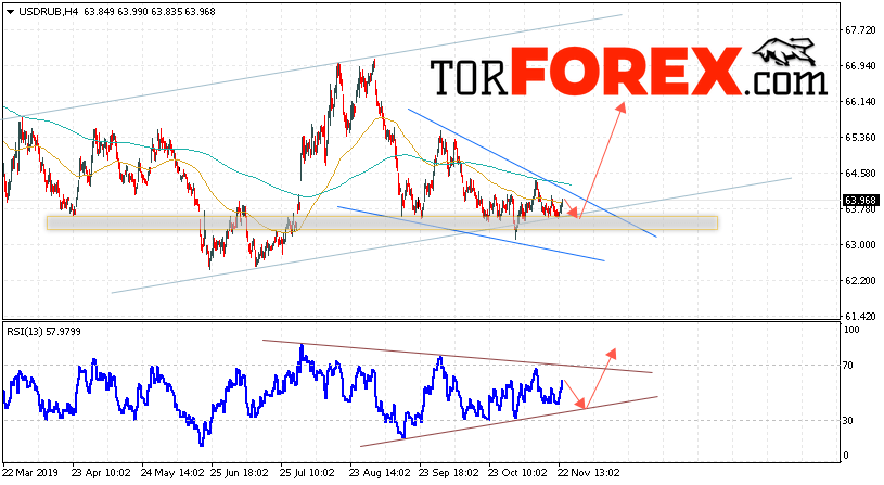 В пользу роста пары USD/RUB 26 ноября 2019 выступит тест восходящей линии тренда на индикаторе относительной силы. Вторым сигналом станет отскок от нижней границы восходящего канала. Отменой варианта роста пары USD/RUB на Форекс станет падение и пробой уровня 62.75 Рублей за Доллар. Это укажет на пробой области поддержки и продолжение падения пары Доллар Рубль в область ниже уровня 61.05. Подтверждением роста пары выступит пробой верхней границы модели «Клин» и закрытие над уровнем 64.75.