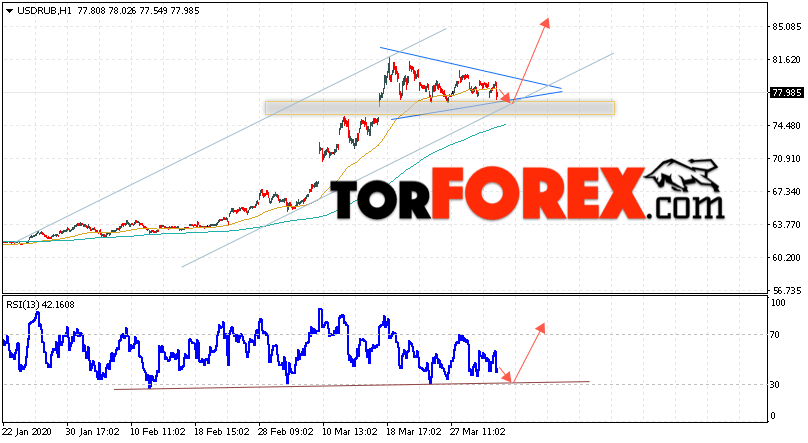Дополнительным сигналом в пользу роста пары USD/RUB 3 апреля 2020 выступит тест линии поддержки на индикаторе относительной силы. Вторым сигналом станет отскок от нижней границы восходящего канала. Отменой варианта роста пары USD/RUB на Форекс станет падение и пробой уровня 74.35. Рублей за Доллар. Это укажет на пробой области поддержки и продолжение снижения пары Доллар Рубль в область ниже уровня 68.05. Подтверждением роста пары выступит пробой области сопротивления и закрытие над уровнем 82.05.