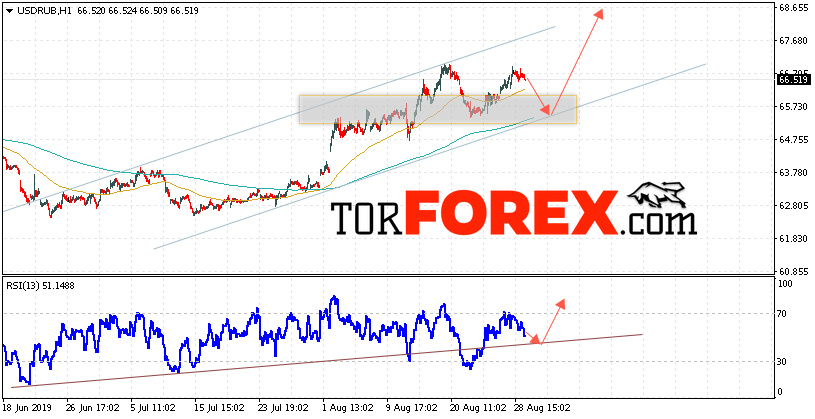 В пользу подъёма пары USD/RUB 30 августа 2019 выступит тест линии поддержки на индикаторе относительной силы. Вторым сигналом станет отскок от нижней границы бычьего канала. Отменой варианта роста пары USD/RUB на Форекс станет падение и пробой уровня 64.70 Рублей за Доллар. Это укажет на пробой области поддержки и продолжение падения пары Доллар Рубль в область ниже уровня 62.45. Подтверждением роста пары выступит пробой области сопротивления и закрытие над уровнем 67.05.