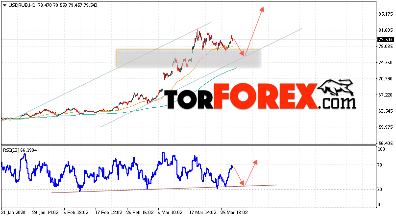 Дополнительным сигналом в пользу роста пары USD/RUB 31 марта 2020 выступит тест линии поддержки на индикаторе относительной силы. Вторым сигналом станет отскок от нижней границы восходящего канала. Отменой варианта роста пары USD/RUB на Форекс станет падение и пробой уровня 73.05. Рублей за Доллар. Это укажет на пробой области поддержки и продолжение снижения пары Доллар Рубль в область ниже уровня 67.65. Подтверждением роста пары выступит пробой области сопротивления и закрытие над уровнем 81.95.