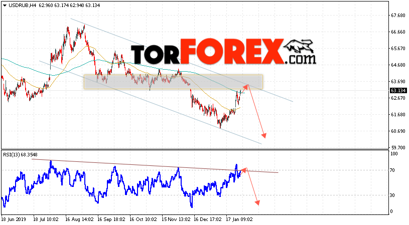 В пользу снижения пары USD/RUB 31 января 2020 выступит тест нисходящей линии тренда на индикаторе относительной силы. Вторым сигналом станет отскок от верхней границы нисходящего канала. Отменой варианта падения пары USD/RUB на Форекс станет сильный рост и пробой уровня 63.75 Рублей за Доллар. Это укажет на пробой области сопротивления и продолжение роста пары Доллар Рубль в область выше уровня 65.95. Подтверждением падения пары выступит пробой области поддержки и закрытие под уровнем 60.55.