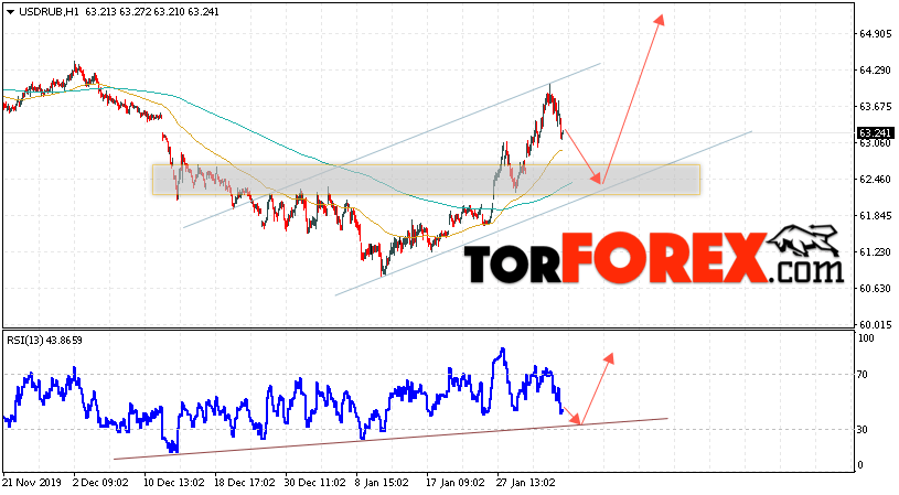 В пользу подъёма пары USD/RUB 5 февраля 2020 выступит тест пробитой линии тренда на индикаторе относительной силы. Вторым сигналом станет отскок от нижней границы восходящего канала. Отменой варианта роста пары USD/RUB на Форекс станет падение и пробой уровня 63.75 Рублей за Доллар. Это укажет на пробой области поддержки и продолжение падения пары Доллар Рубль в область ниже уровня 61.75. Подтверждением роста пары выступит пробой области сопротивления и закрытие над уровнем 64.35.