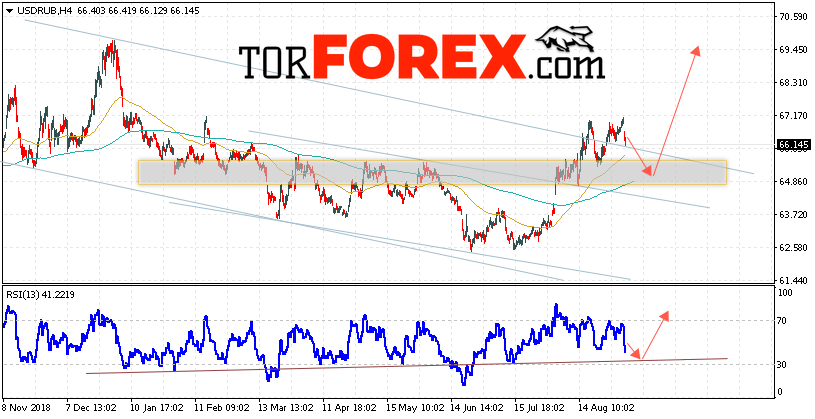 В пользу подъёма пары USD/RUB 5 сентября 2019 выступит тест линии поддержки на индикаторе относительной силы. Вторым сигналом станет отскок от верхней границы нисходящего канала. Отменой варианта роста пары USD/RUB на Форекс станет падение и пробой уровня 63.75 Рублей за Доллар. Это укажет на пробой области поддержки и продолжение падения пары Доллар Рубль в область ниже уровня 62.45. Подтверждением роста пары выступит пробой области сопротивления и закрытие над уровнем 67.45.