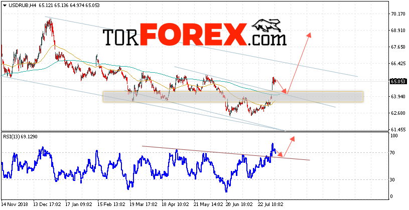 В пользу подъёма пары USD/RUB 7 августа 2019 выступит тест линии поддержки на индикаторе относительной силы. Вторым сигналом станет отскок от верхней границы нисходящего канала. Отменой варианта роста пары USD/RUB на Форекс станет падение и пробой уровня 62.55 Рублей за Доллар. Это укажет на пробой области поддержки и продолжение падения пары Доллар Рубль в область ниже уровня 61.45. Подтверждением роста пары выступит пробой области сопротивления и закрытие над уровнем 66.25.