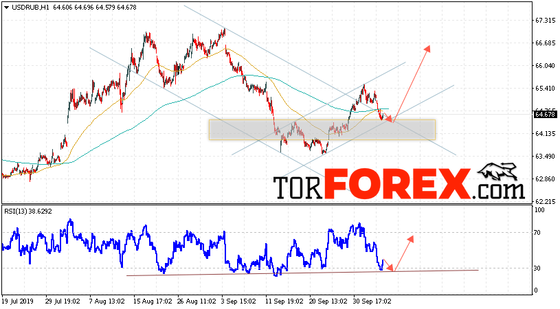 В пользу роста пары USD/RUB 8 октября 2019 выступит тест пробитой линии тренда на индикаторе относительной силы. Вторым сигналом станет отскок от нижней границы восходящего канала. Отменой варианта роста пары USD/RUB на Форекс станет падение и пробой уровня 63.55 Рублей за Доллар. Это укажет на пробой области поддержки и продолжение снижения пары Доллар Рубль в область ниже уровня 61.25. Подтверждением подъёма пары выступит пробой области сопротивления и закрытие над уровнем 66.05.
