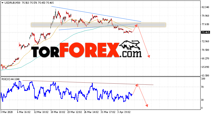 Дополнительным сигналом в пользу падения пары USD/RUB 9 апреля 2020 выступит тест линии сопротивления на индикаторе относительной силы. Вторым сигналом станет отскок от нижней границы восходящего канала. Отменой варианта падения пары USD/RUB на Форекс станет сильный рост и пробой уровня 81.05. Рублей за Доллар. Это укажет на пробой области сопротивления и продолжение роста пары Доллар Рубль в область выше уровня 85.55. Подтверждением падения пары выступит пробой области поддержки и закрытие под уровнем 72.55.