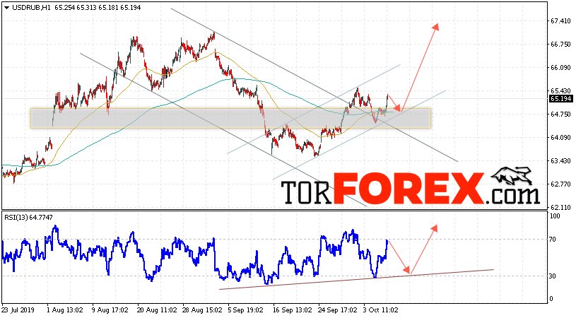 В пользу роста пары USD/RUB 9 октября 2019 выступит тест пробитой линии тренда на индикаторе относительной силы. Вторым сигналом станет отскок от нижней границы восходящего канала. Отменой варианта роста пары USD/RUB на Форекс станет падение и пробой уровня 64.05 Рублей за Доллар. Это укажет на пробой области поддержки и продолжение снижения пары Доллар Рубль в область ниже уровня 61.85. Подтверждением подъёма пары выступит пробой области сопротивления и закрытие над уровнем 66.15.