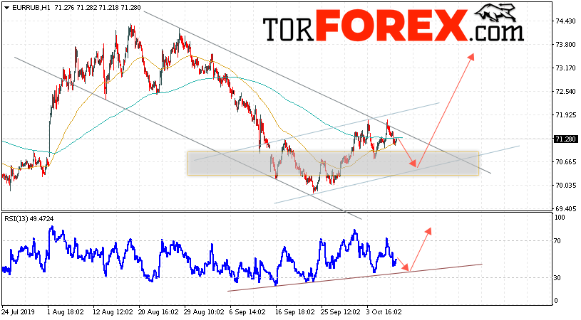 Дополнительным сигнальном в пользу роста валютной пары EUR/RUB на Форекс выступит тест восходящей линии тренда на индикаторе относительной силы. Вторым сигналом в пользу роста курса станет отскок от нижней границы восходящего канала. Отменой варианта роста пары EUR/RUB на Форекс 10 октября 2019 станет падение и пробой уровня 69.45 Евро за Рубль. Это укажет на пробой области поддержки и продолжение падения пары Евро Рубль в область ниже уровня 67.05. Подтверждением роста валютной пары выступит пробой области сопротивления и закрытие котировок инструмента над уровнем 72.25.