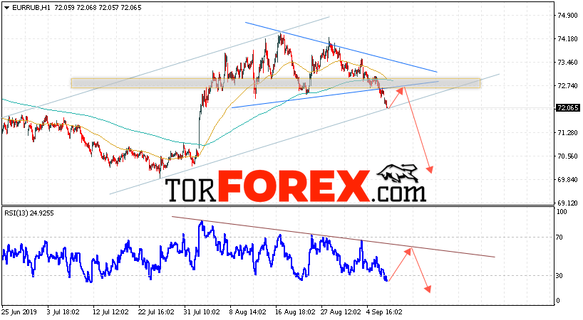 Дополнительным сигнальном в пользу роста пары EUR/RUB выступит тест восходящей линии тренда на индикаторе относительной силы. Вторым сигналом станет отскок от нижней границы модели «Треугольник». Отменой варианта падения пары EUR/RUB на Форекс 10 сентября 2019 станет сильный рост и пробой уровня 73.65 Евро за Рубль. Это укажет на пробой верхней границы модели «Треугольник» и продолжение роста пары Евро Рубль в область выше уровня 76.85. Подтверждением падения валютной пары выступит пробой нижней границы восходящего канала и закрытие под уровнем 71.65.
