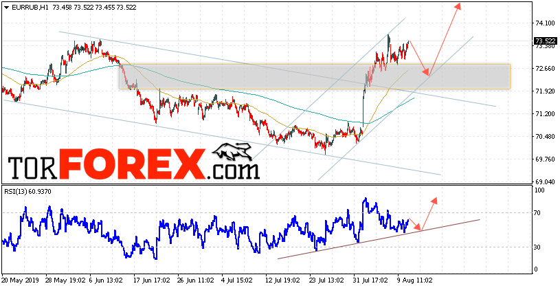 Дополнительным сигнальном в пользу роста пары EUR/RUB выступит тест восходящей линии тренда на индикаторе относительной силы. Вторым сигналом станет отскок от нижней границы восходящего канала. Отменой варианта роста пары EUR/RUB на Форекс 13 августа 2019 станет падение и пробой уровня 71.50 Евро за Рубль. Это укажет на пробой области поддержки и продолжение падения пары Евро Рубль в область ниже уровня 70.65. Подтверждением роста валютной пары выступит пробой области сопротивления и закрытие над уровнем 74.05.