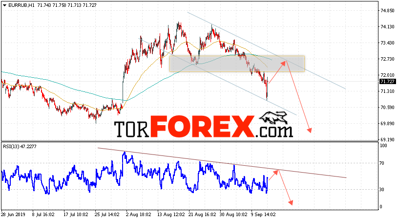 Дополнительным сигнальном в пользу снижения валютной пары EUR/RUB на Форекс выступит тест нисходящей линии сопротивления на индикаторе относительной силы. Вторым сигналом станет отскок от верхней границы нисходящего канала. Отменой варианта падения пары EUR/RUB на Форекс 13 сентября 2019 станет сильный рост и пробой уровня 73.55 Евро за Рубль. Это укажет на пробой верхней границы канала и продолжение роста пары Евро Рубль в область выше уровня 76.45. Подтверждением падения валютной пары выступит пробой области поддержки и закрытие котировок инструмента под уровнем 70.65.
