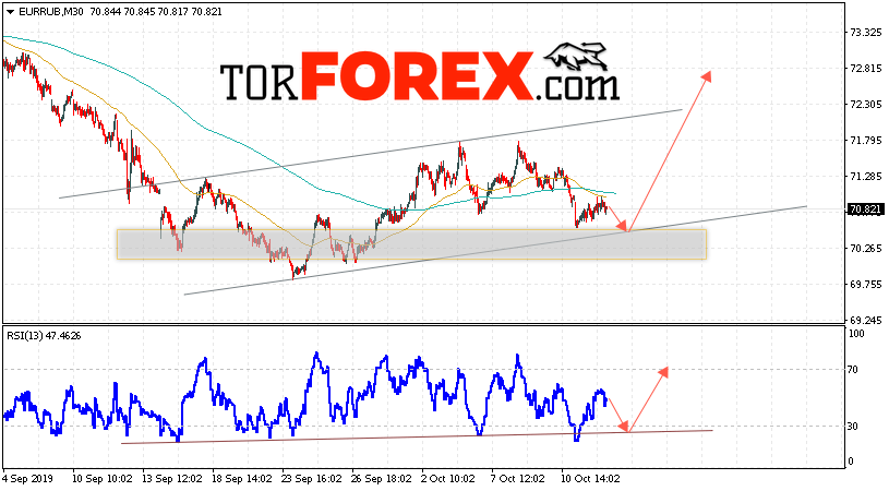 Дополнительным сигнальном в пользу роста валютной пары EUR/RUB на Форекс выступит тест восходящей линии тренда на индикаторе относительной силы. Вторым сигналом в пользу роста курса станет отскок от нижней границы восходящего канала. Отменой варианта роста пары EUR/RUB на Форекс 15 октября 2019 станет падение и пробой уровня 69.75 Евро за Рубль. Это укажет на пробой области поддержки и продолжение падения пары Евро Рубль в область ниже уровня 67.25. Подтверждением роста валютной пары выступит пробой области сопротивления и закрытие котировок инструмента над уровнем 71.85.