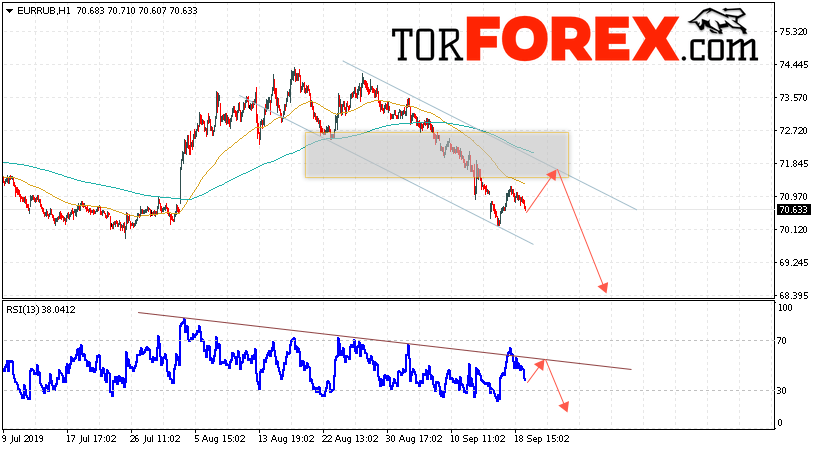 Дополнительным сигнальном в пользу снижения валютной пары EUR/RUB на Форекс выступит тест нисходящей линии сопротивления на индикаторе относительной силы. Вторым сигналом в пользу падения станет отскок от верхней границы нисходящего канала. Отменой варианта падения пары EUR/RUB на Форекс 20 сентября 2019 станет сильный рост и пробой уровня 72.55 Евро за Рубль. Это укажет на пробой верхней границы канала и продолжение роста пары Евро Рубль в область выше уровня 74.55. Подтверждением падения валютной пары выступит пробой области поддержки и закрытие котировок инструмента под уровнем 70.05.