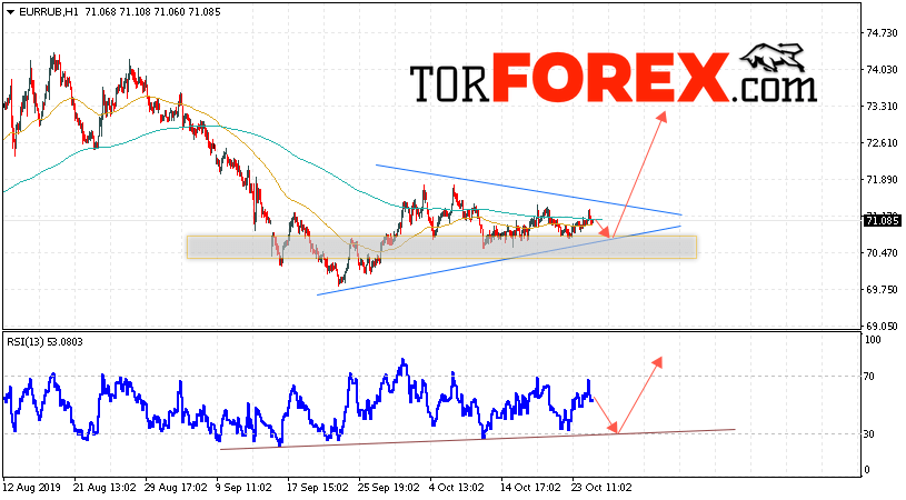 Дополнительным сигнальном в пользу роста валютной пары EUR/RUB на Форекс выступит тест восходящей линии тренда на индикаторе относительной силы. Вторым сигналом в пользу роста курса станет отскок от нижней границы модели «Треугольник». Отменой варианта роста пары EUR/RUB на Форекс 25 октября 2019 станет падение и пробой уровня 69.85 Евро за Рубль. Это укажет на пробой области поддержки и продолжение падения пары Евро Рубль в область ниже уровня 67.25. Подтверждением роста валютной пары выступит пробой области сопротивления и закрытие котировок инструмента над уровнем 71.95.