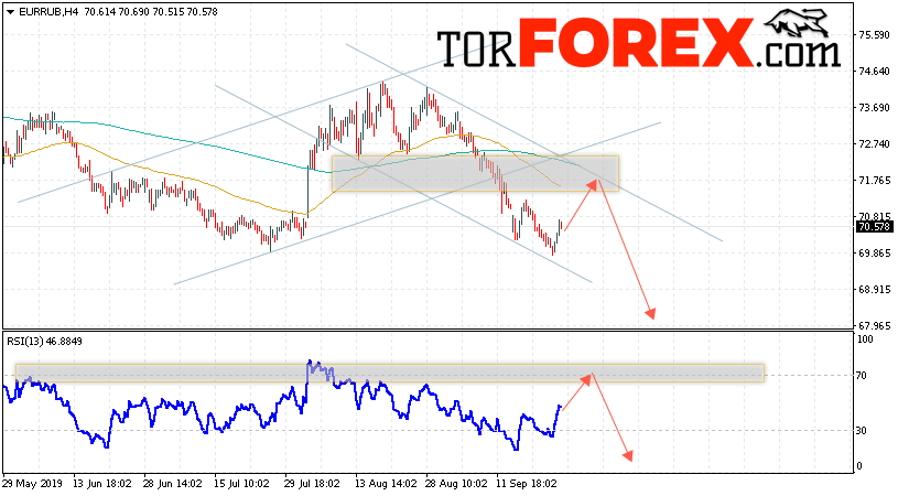 Дополнительным сигнальном в пользу снижения валютной пары EUR/RUB на Форекс выступит тест области сопротивления на индикаторе относительной силы. Вторым сигналом в пользу падения курса станет отскок от верхней границы нисходящего канала. Отменой варианта падения пары EUR/RUB на Форекс 26 сентября 2019 станет сильный рост и пробой уровня 72.25 Евро за Рубль. Это укажет на пробой верхней границы канала и продолжение роста пары Евро Рубль в область выше уровня 73.55. Подтверждением падения валютной пары выступит пробой области поддержки и закрытие котировок инструмента под уровнем 69.45.