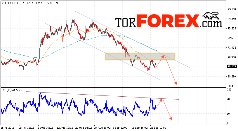 Дополнительным сигнальном в пользу снижения валютной пары EUR/RUB на Форекс выступит тест линии сопротивления на индикаторе относительной силы. Вторым сигналом в пользу падения курса станет отскок от верхней границы нисходящего канала. Отменой варианта падения пары EUR/RUB на Форекс 27 сентября 2019 станет сильный рост и пробой уровня 71.95 Евро за Рубль. Это укажет на пробой верхней границы канала и продолжение роста пары Евро Рубль в область выше уровня 73.65. Подтверждением падения валютной пары выступит пробой области поддержки и закрытие котировок инструмента под уровнем 69.25.