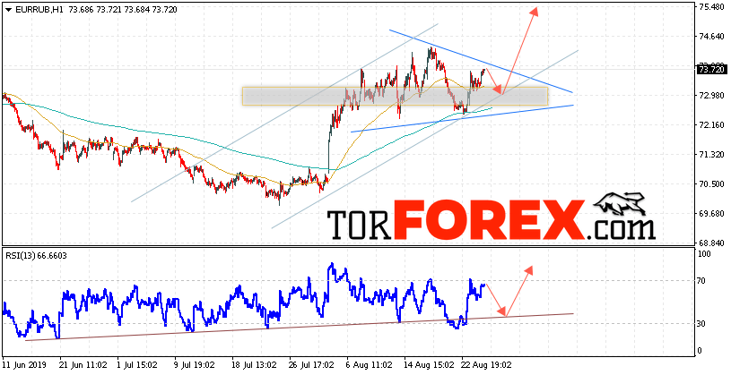 Дополнительным сигнальном в пользу роста пары EUR/RUB выступит тест восходящей линии тренда на индикаторе относительной силы. Вторым сигналом станет отскок от нижней границы модели «Треугольник». Отменой варианта роста пары EUR/RUB на Форекс 28 августа 2019 станет падение и пробой уровня 71.85 Евро за Рубль. Это укажет на пробой нижней границы модели и продолжение падения пары Евро Рубль в область ниже уровня 69.55. Подтверждением роста валютной пары выступит пробой верхней границы модели «Треугольник» и закрытие над уровнем 74.35.
