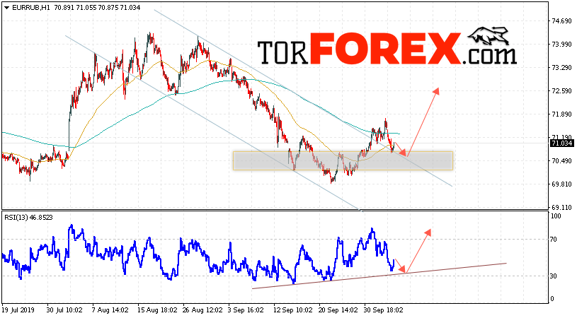 Дополнительным сигнальном в пользу роста валютной пары EUR/RUB на Форекс выступит тест восходящей линии тренда на индикаторе относительной силы. Вторым сигналом в пользу роста курса станет отскок от верхней границы нисходящего канала. Отменой варианта роста пары EUR/RUB на Форекс 8 октября 2019 станет падение и пробой уровня 69.75 Евро за Рубль. Это укажет на пробой области поддержки и продолжение падения пары Евро Рубль в область ниже уровня 67.25. Подтверждением роста валютной пары выступит пробой области сопротивления и закрытие котировок инструмента над уровнем 72.35.