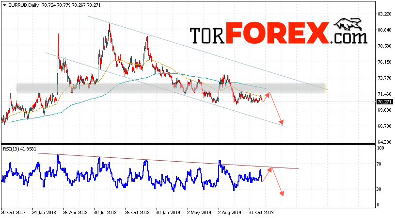 Валютная пара Евро Рубль EUR/RUB завершает торговую неделю вблизи области 70.27 и продолжает движение в рамках падения и нисходящего канала. Скользящие средние указывают на наличие медвежьей тенденции по паре, цены продолжают отталкиваться от сигнальных линий, что указывает на давление со стороны медведей. В рамках прогноза курса Евро к Рублю на текущую торговую неделю стоит ожидать попытку развития восходящей коррекции и тест уровня сопротивления вблизи области 71.45 Рублей за Евро. Затем, отскок и продолжение падения валютной пары в область ниже уровня 66.65.