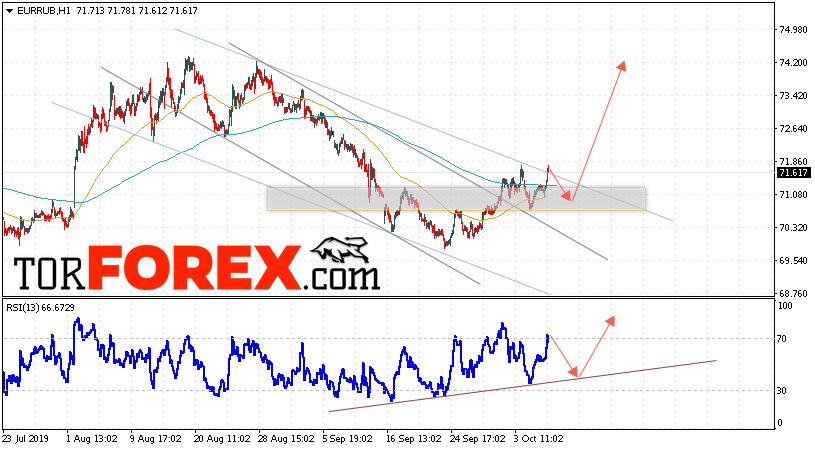 Дополнительным сигнальном в пользу роста валютной пары EUR/RUB на Форекс выступит тест восходящей линии тренда на индикаторе относительной силы. Вторым сигналом в пользу роста курса станет отскок от верхней границы нисходящего канала. Отменой варианта роста пары EUR/RUB на Форекс 9 октября 2019 станет падение и пробой уровня 69.45 Евро за Рубль. Это укажет на пробой области поддержки и продолжение падения пары Евро Рубль в область ниже уровня 67.05. Подтверждением роста валютной пары выступит пробой области сопротивления и закрытие котировок инструмента над уровнем 72.45.