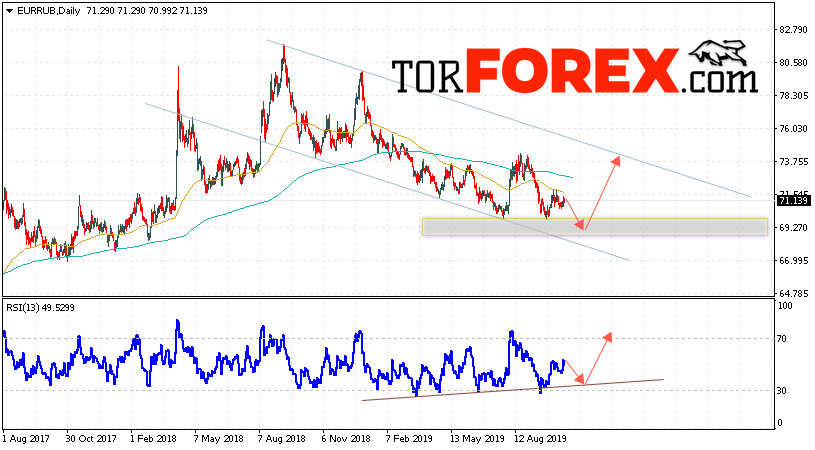 Таким образом, Прогноз курса Евро к Рублю на неделю 21 — 25 октября 2019 предполагает попытку теста уровня поддержки вблизи области 69.25. Откуда стоит ожидать отскок и продолжения роста курса Евро против Рубля с целью выше уровня 73.75. Дополнительным сигналом в пользу подъёма пары выступит тест линии тренда на индикаторе относительной силы. Отменой варианта роста станет пробой нижней границы нисходящего канала и закрытие котировок под уровнем 66.65. Это укажет на ускорение снижения к уровню 65.05.