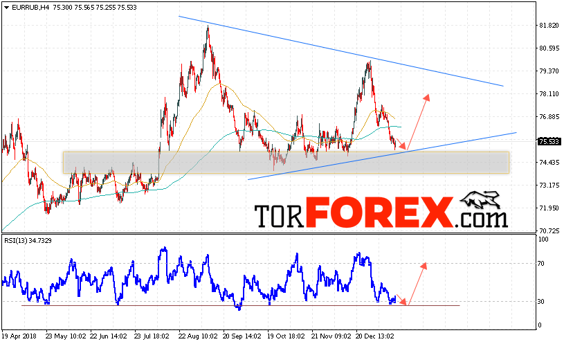Таким образом, EUR/RUB прогноз курса Евро Рубль на 22 января 2019 предполагает попытку теста уровня поддержки вблизи области 75.05. Откуда стоит ожидать отскок и продолжения роста курса Евро против Рубля с целью выше уровня 78.10. Дополнительным сигналом в пользу подъёма пары выступит тест линии тренда на индикаторе относительной силы. Отменой варианта роста станет пробой области поддержки и закрытие котировок ниже уровня 74.50.