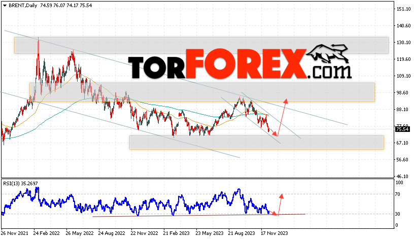 Дополнительным сигналом в пользу роста котировок нефти на текущей неделе выступит тест линии поддержки на индикаторе относительной силы. Вторым сигналом станет отскок от нижней границы бычьего канала. Отменой варианта роста котировок и цен на нефть BRENT на торговой неделе 11 — 15 декабря 2023 станет падение и пробой уровня 65.05. Это укажет на пробой области поддержки и продолжение падения нефти в область ниже уровня 60.05. С пробоем области сопротивления и закрытием котировок выше уровня 91.55 стоит ожидать подтверждения подъёма котировок, что укажет на пробой верхней границы нисходящего канала.