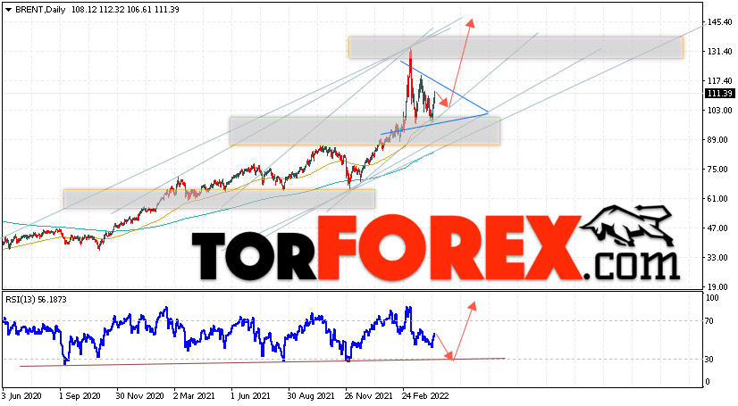 Дополнительным сигналом в пользу роста котировок нефти на текущей неделе выступит тест линии поддержки на индикаторе относительной силы. Вторым сигналом станет отскок от нижней границы бычьего канала. Отменой варианта роста котировок и цен на нефть BRENT на торговой неделе 18 — 22 апреля 2022 станет падение и пробой уровня 95.05. Это укажет на пробой области поддержки и продолжение падения нефти в область ниже уровня 85.05. С пробоем области сопротивления и закрытием котировок выше уровня 120.05 стоит ожидать подтверждения подъёма цены на нефть BRENT и начала отработки модели ”Треугольник”.