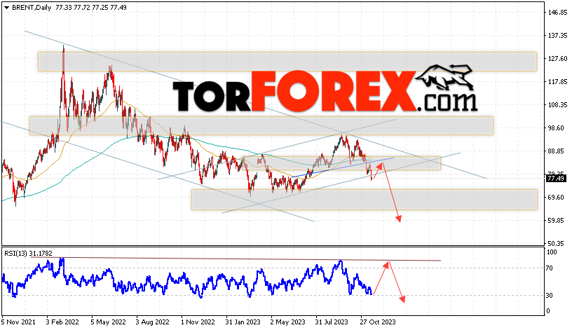 Дополнительным сигналом в пользу падения котировок нефти на текущей неделе выступит тест линии сопротивления на индикаторе относительной силы. Вторым сигналом станет отскок от нижней границы разворотной модели «Голова и плечи». Отменой варианта падения котировок и цен на нефть BRENT на торговой неделе 20 — 24 ноября 2023 станет сильный рост и пробой уровня 88.95. Это укажет на пробой области сопротивления и продолжение роста нефти в область выше уровня 94.65. С пробоем области поддержки и закрытием котировок ниже уровня 76.05.