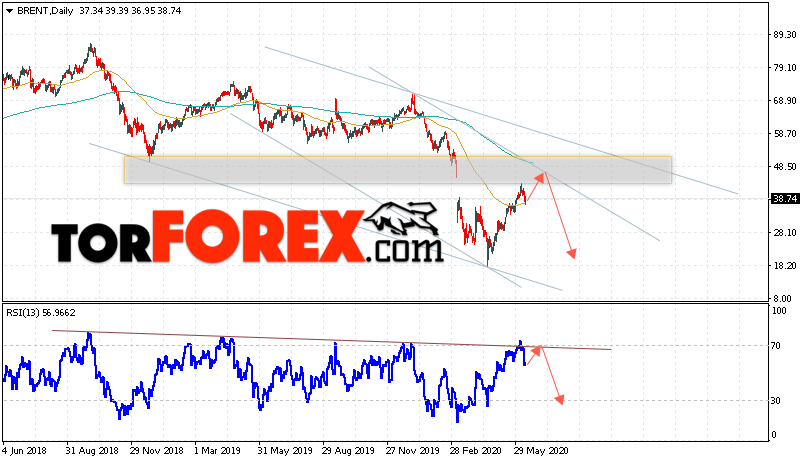 Дополнительным сигналом в пользу падения котировок нефти на текущей неделе выступит тест линии сопротивления на индикаторе относительной силы. Вторым сигналом станет отскок от верхней границы нисходящего канала. Отменой варианта падения котировок и цен на нефть BRENT на торговой неделе 15 — 19 июня 2020 станет сильный рост и пробой уровня 50.95. Это укажет на пробой области сопротивления и продолжение роста нефти в область выше уровня 60.05. С пробоем области поддержки и закрытием котировок ниже уровня 35.05 стоит ожидать подтверждения падения цены на нефть BRENT.