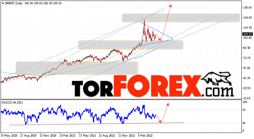 Дополнительным сигналом в пользу роста котировок нефти на текущей неделе выступит тест линии поддержки на индикаторе относительной силы. Вторым сигналом станет отскок от нижней границы бычьего канала. Отменой варианта роста котировок и цен на нефть BRENT на торговой неделе 2 — 6 мая 2022 станет падение и пробой уровня 95.05. Это укажет на пробой области поддержки и продолжение падения нефти в область ниже уровня 85.05. С пробоем области сопротивления и закрытием котировок выше уровня 120.05 стоит ожидать подтверждения подъёма цены на нефть BRENT и начала отработки модели ”Треугольник”.