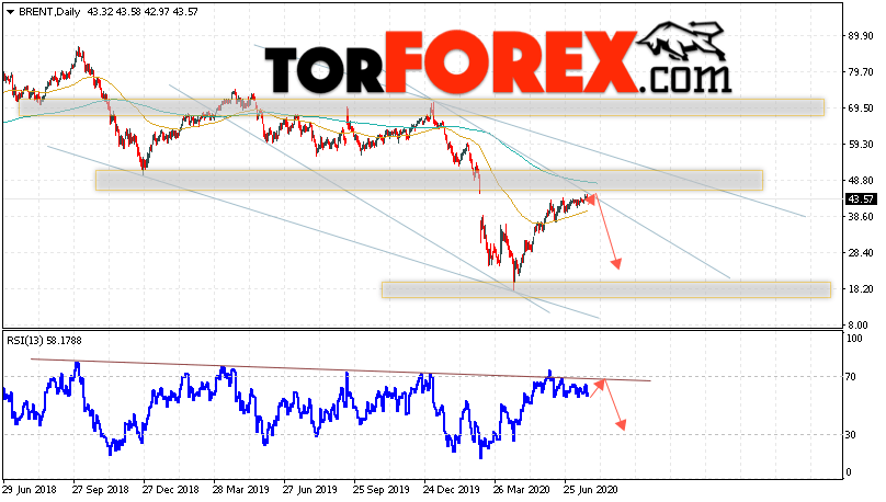 Дополнительным сигналом в пользу падения котировок нефти на текущей неделе выступит тест линии сопротивления на индикаторе относительной силы. Вторым сигналом станет отскок от верхней границы нисходящего канала. Отменой варианта падения котировок и цен на нефть BRENT на торговой неделе 27 — 31 июля 2020 станет сильный рост и пробой уровня 50.65. Это укажет на пробой области сопротивления и продолжение роста нефти в область выше уровня 57.55. С пробоем области поддержки и закрытием котировок ниже уровня 36.45 стоит ожидать подтверждения падения цены на нефть BRENT.